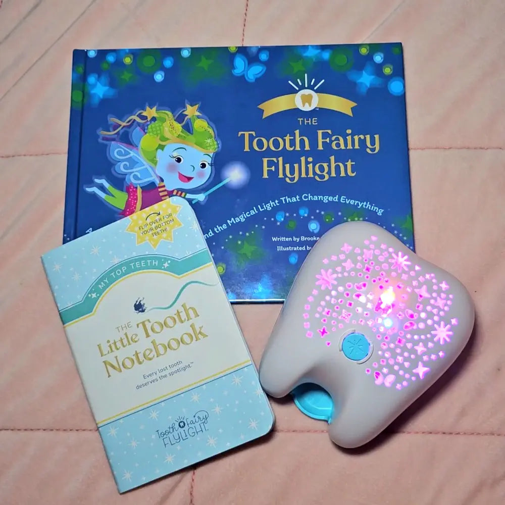 Tooth Fairy Box Set includes: Hardcover illustrated storybook, Flylight projector night light, Little Tooth Notebook keepsake journal