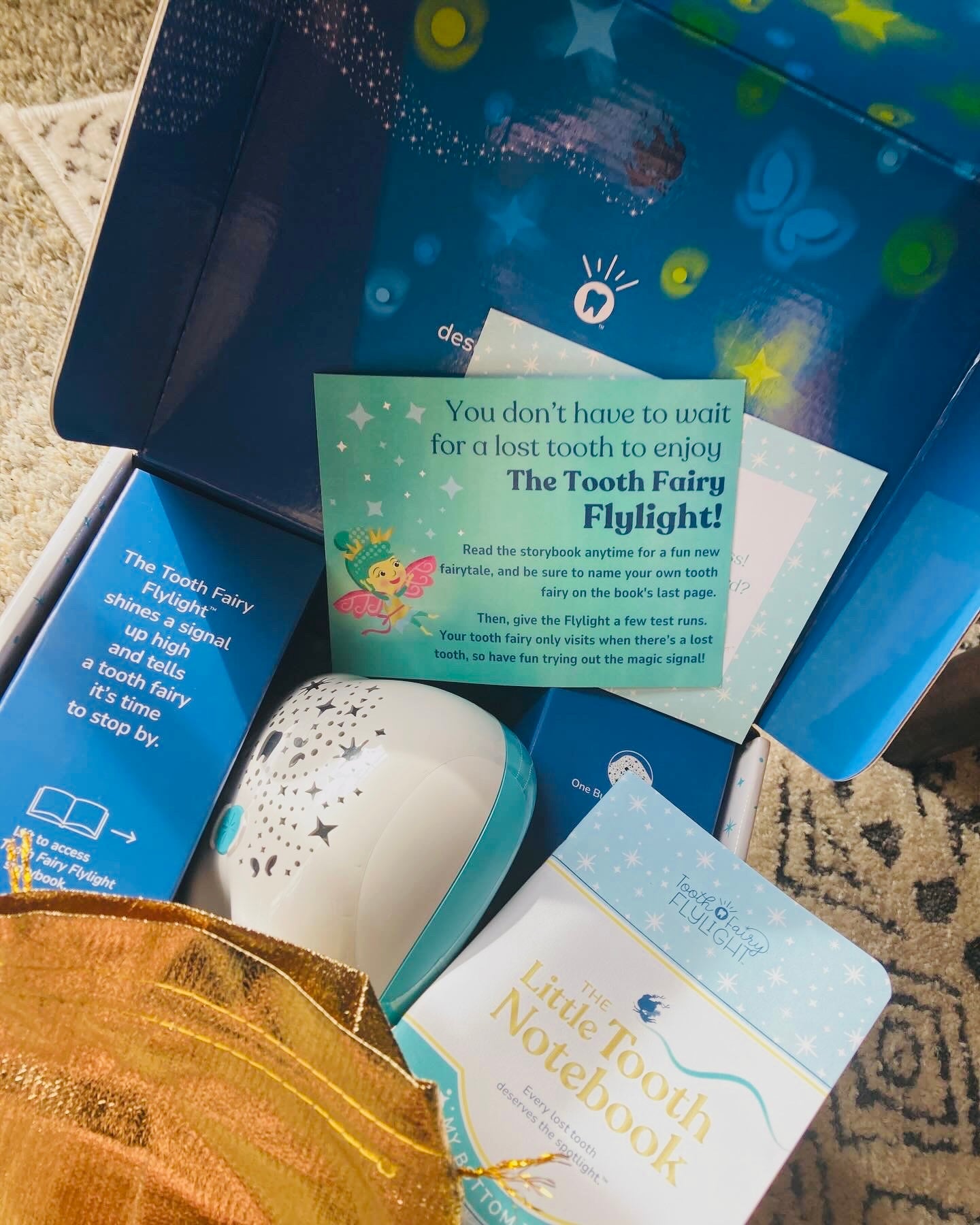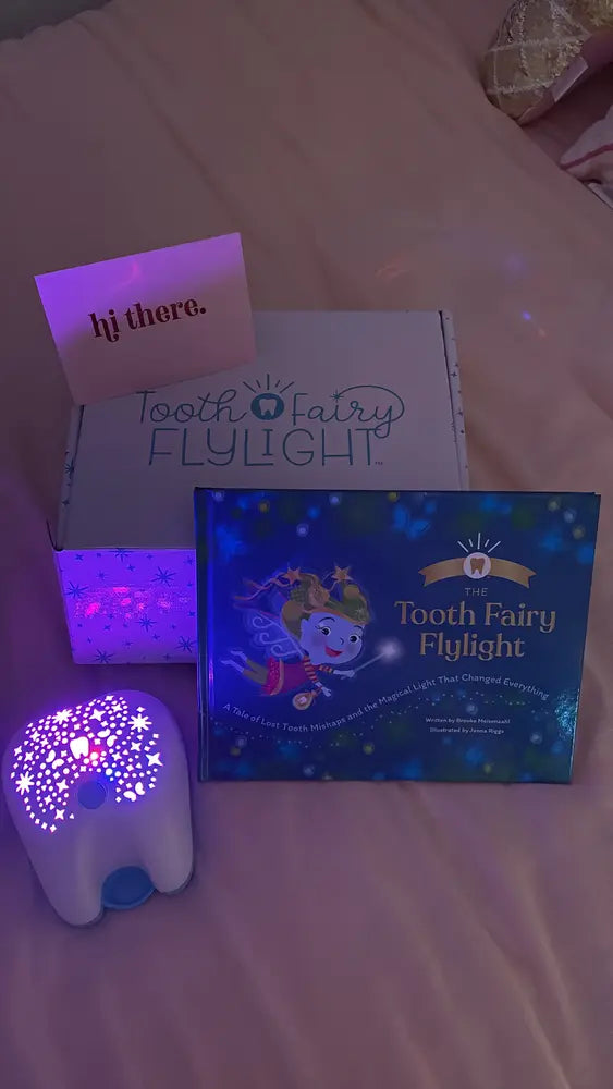 Tooth Fairy Box Set includes: Hardcover illustrated storybook, Flylight projector night light, Little Tooth Notebook keepsake journal