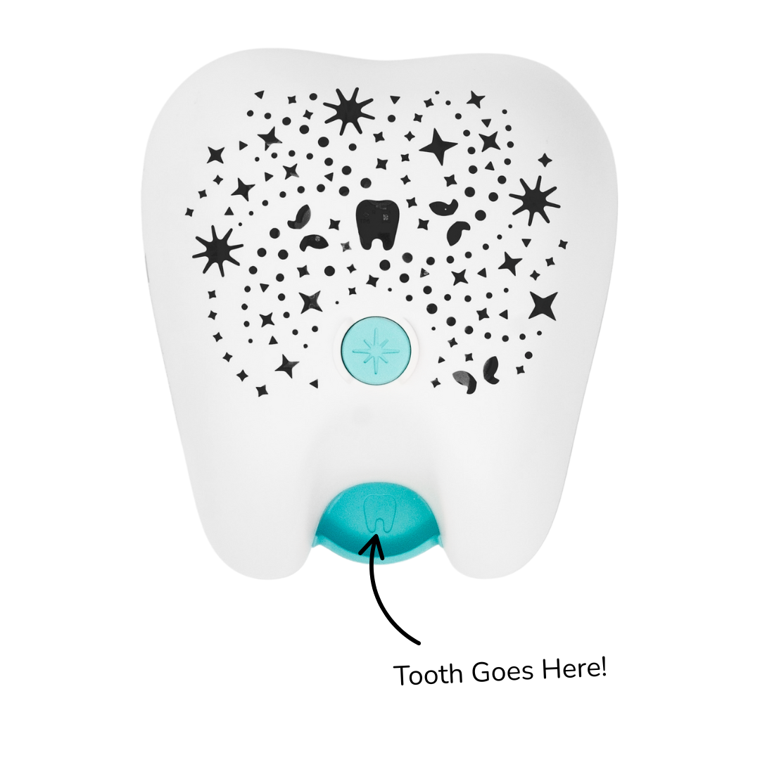 The Tooth Fairy Flylight puts the power to summon their tooth fairy in your child’s hands. They’ll place a lost tooth in the tray then press the button. The glowing tooth night light projects a color-changing pattern on their ceiling to light the way for their tooth fairy to follow.